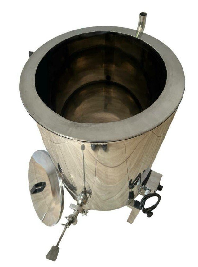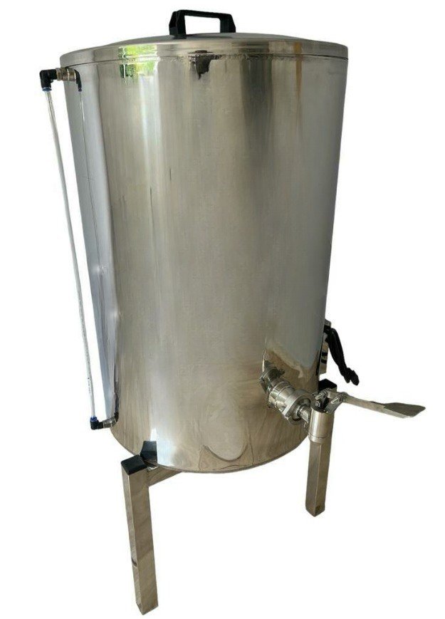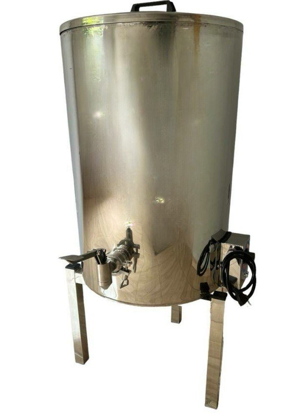 * Função: Envazar e fracionar mel líquido * Construída em aço inox 304 * Sistema de aquecimento por resistência elétrica de 3000 watts * Controle de temperatura por termostato (0 até 80 ºC) * Parede dupla com nível para água * Sistema de banho-maria * Fundo cônico para escoamento total * Capacidade: 100 kg de mel * Pés em tubo inox 40x40, altura de 40 cm * Válvula manual de envase com corte de pingos * Acabamento polido alimentício * Soldas por eletrofusão * Voltagem: 220 volts