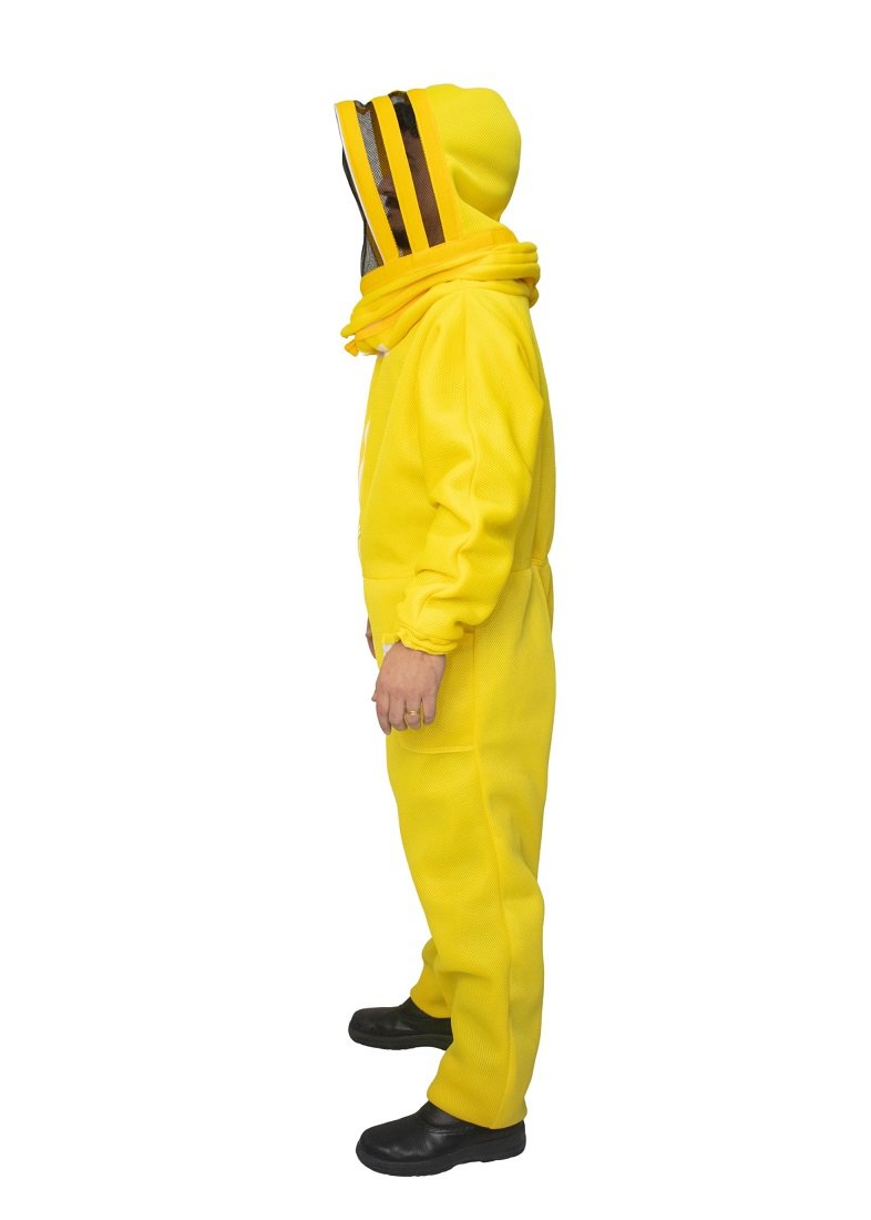 Os punhos e tornozelos com elástico reforçado e travas de fixação impedem a entrada de abelhas. O zíper duplo com vedação em velcro assegura fechamento perfeito, enquanto o capacete americano destacável oferece ampla visibilidade e conforto térmico.